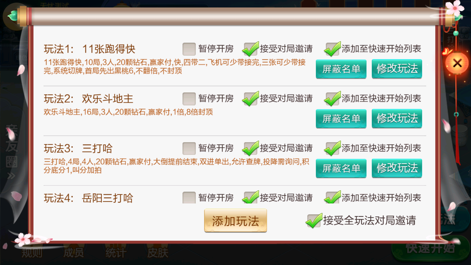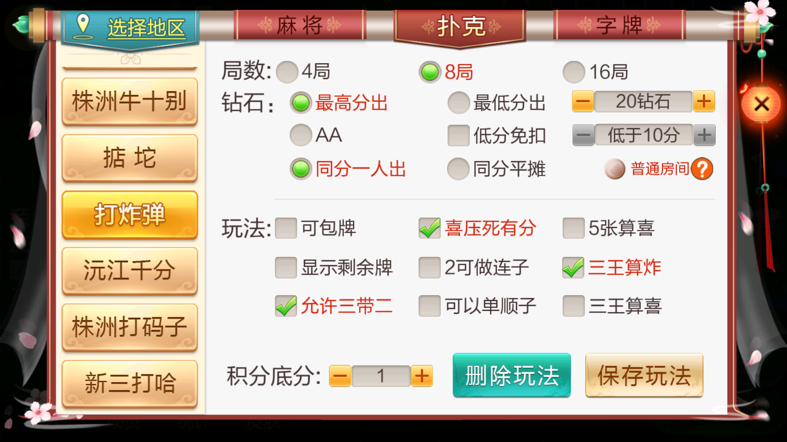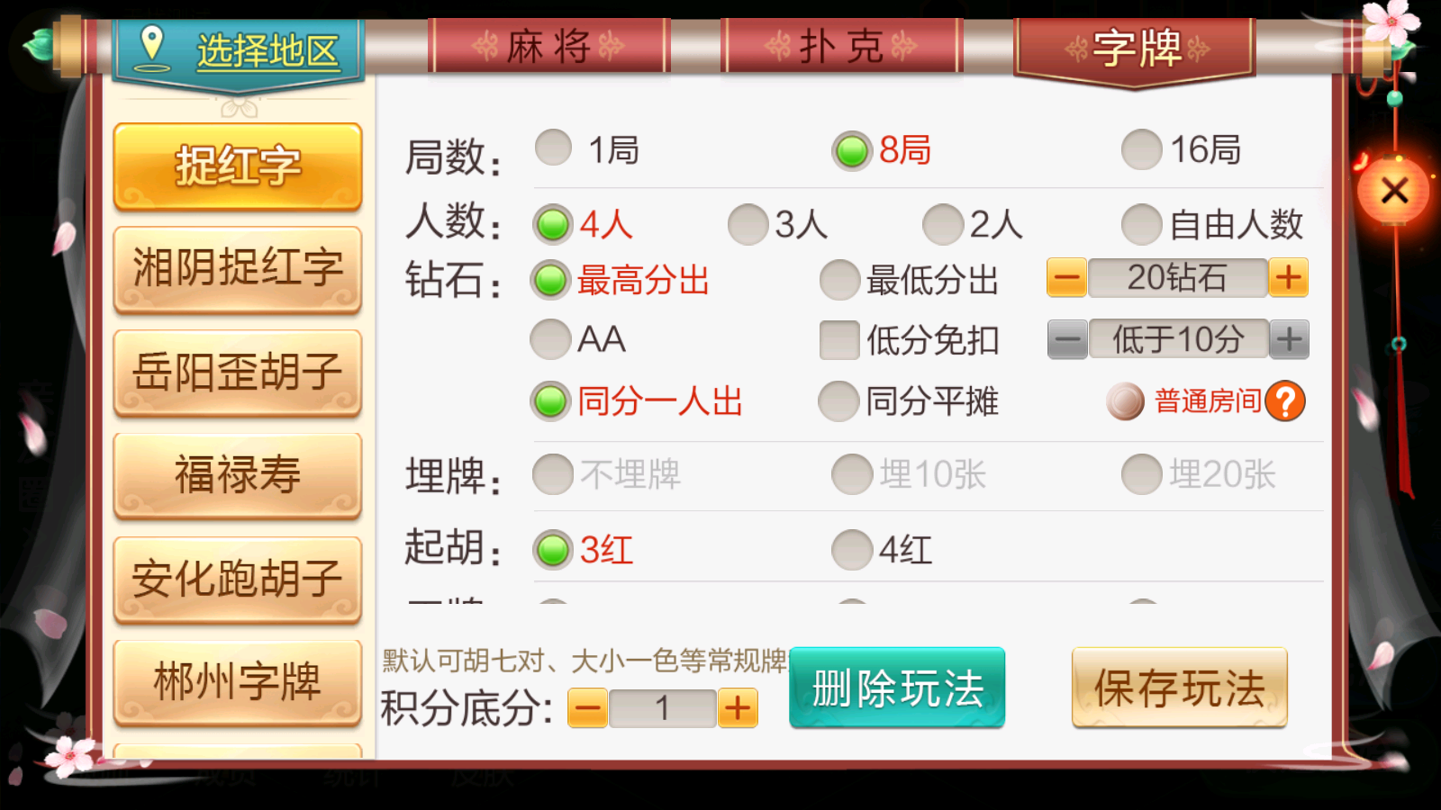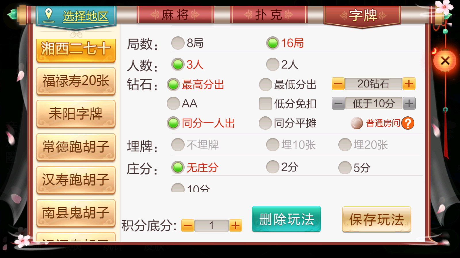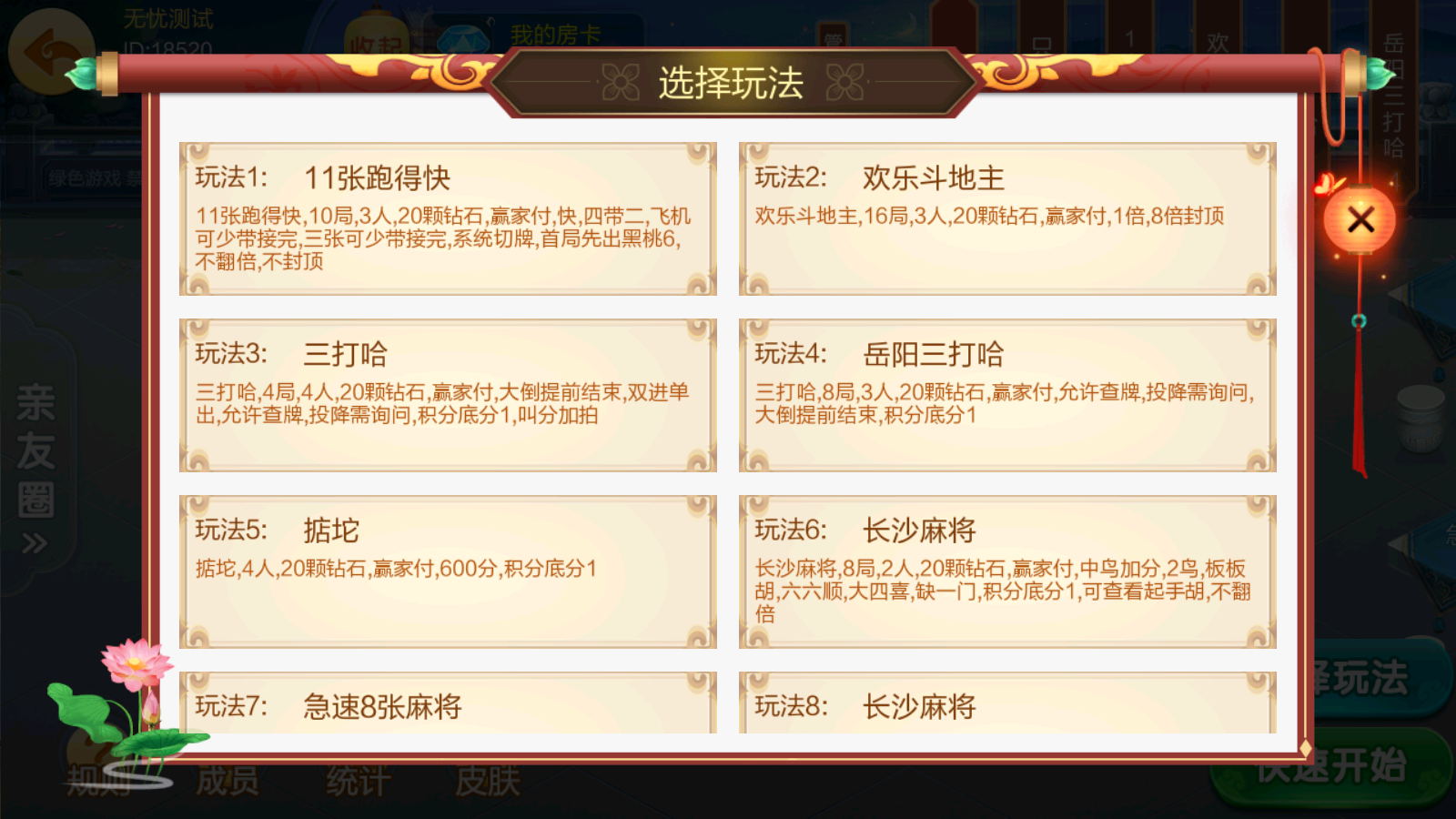 扑克:11张跑得快、跑得快(15、16张)、三打哈、岳阳三打哈、株洲牛十别、掂坨、打炸弹、沅江千分、株洲打码子、新三打哈、半边天炸、打筒子、霸炸弹、衡阳三打哈、湘潭三打哈、永州包牌、